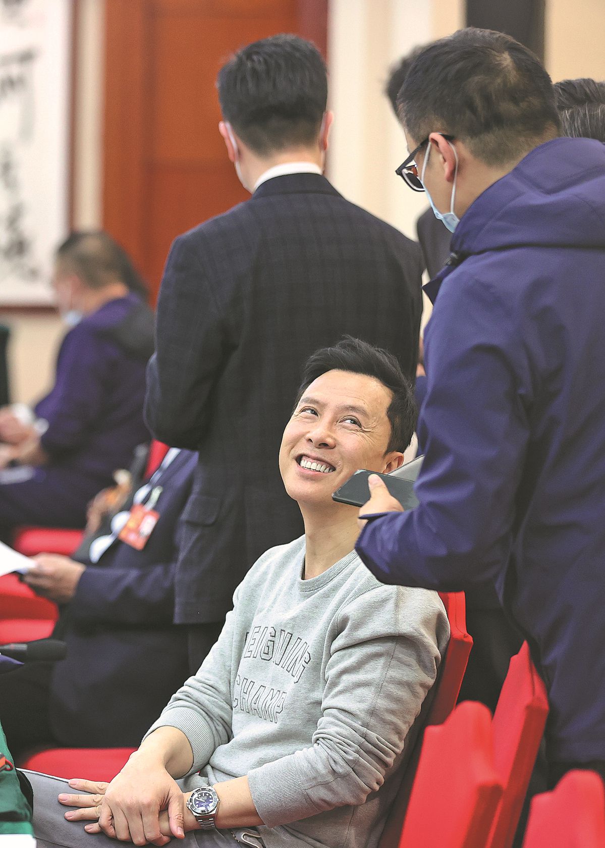 Donnie Yen talks with fellow members in the cultural sector of the National Committee of the Chinese People's Political Consultative Conference during a panel discussion on Sunday in Beijing. [Photo by Jiang Dong /China Daily]