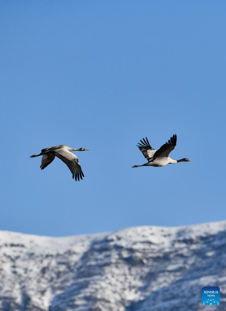 This photo taken on March 1, 2023 shows black-necked cranes in Lhunzhub County of Lhasa, southwest China's Tibet Autonomous Region. (Xinhua/Jigme Dorje)