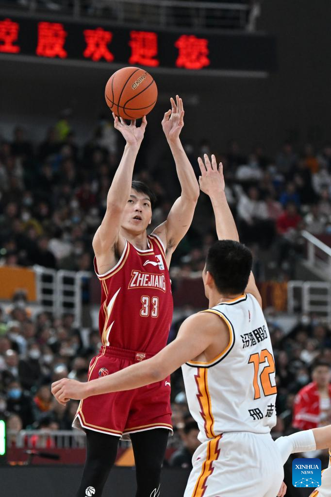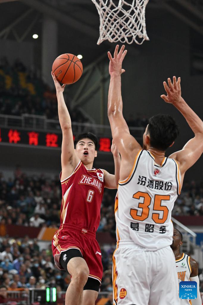 Wu Qian (L) of Zhejiang Golden bulls shoots during the 31st round match between Shanxi Loongs and Zhejiang Golden bulls at the 2022-2023 season of the Chinese Basketball Association (CBA) league in Taiyuan, capital city of north China's Shanxi Province, March 5, 2023. (Xinhua/Zhan Yan)