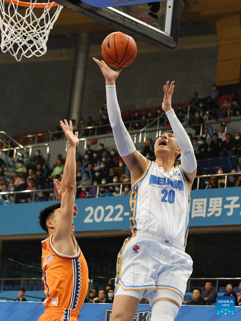 Zhai Xiaochuan (R) of Beijing Ducks goes for a lay up during the 31st round match between Beijing Ducks and Shanghai Sharks at the 2022-2023 season of the Chinese Basketball Association (CBA) league in Beijing, capital of China, March 5, 2023. (Xinhua/Zhang Chenlin)