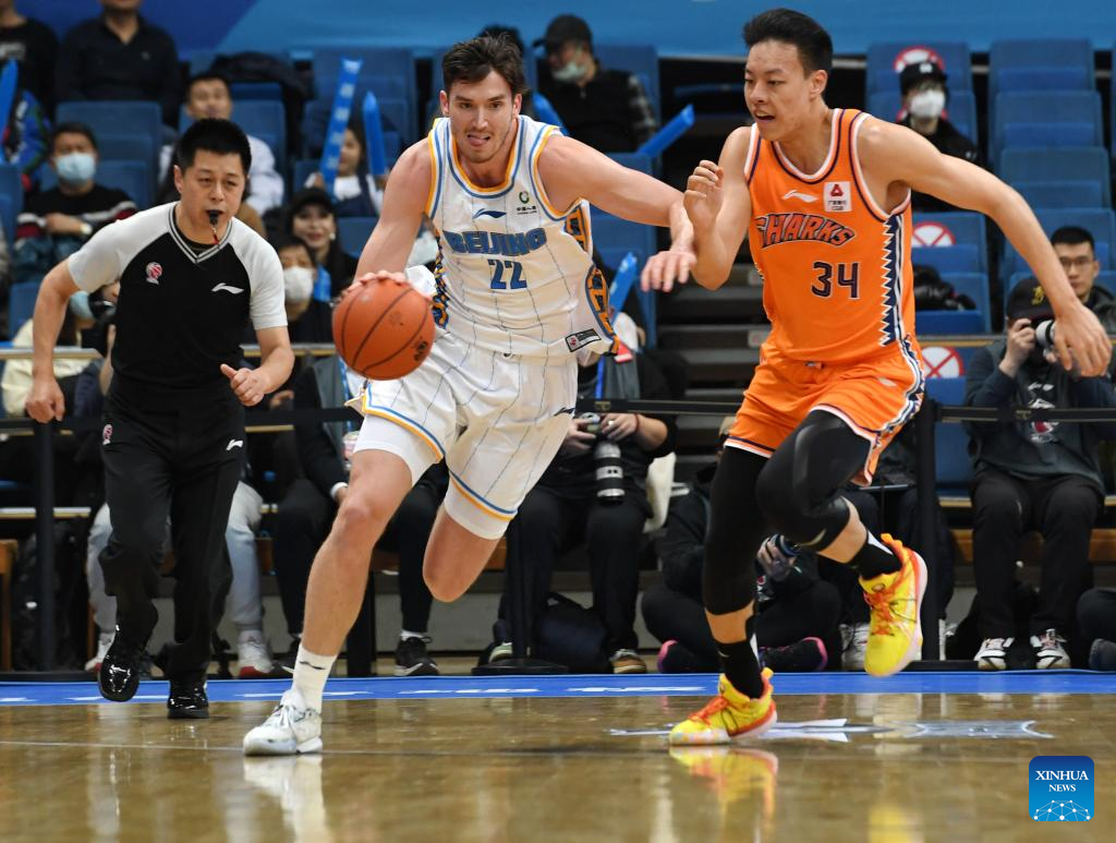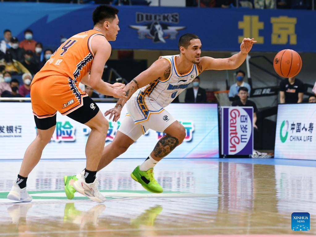 Nick Johnson (R) of Beijing Ducks breaks through during the 31st round match between Beijing Ducks and Shanghai Sharks at the 2022-2023 season of the Chinese Basketball Association (CBA) league in Beijing, capital of China, March 5, 2023. (Xinhua/Zhang Chenlin)