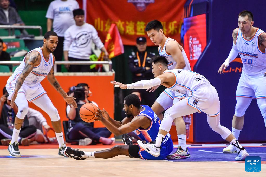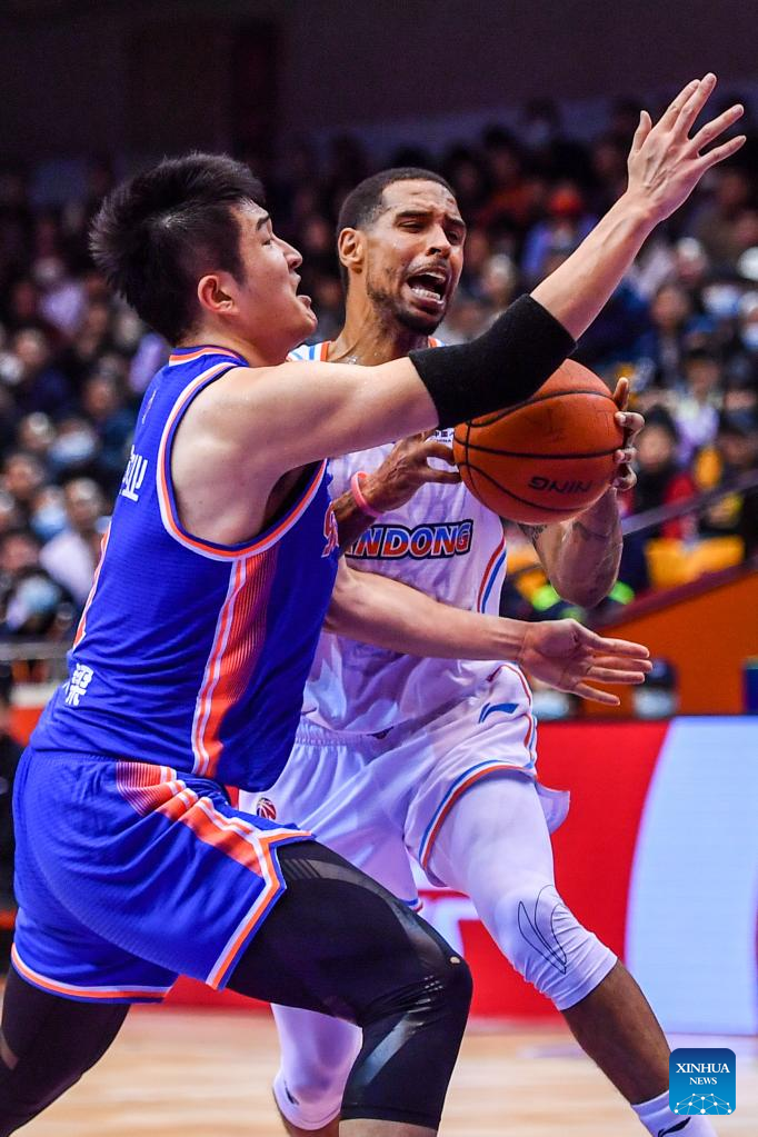 Gao Shiyan (R) of Shandong Heroes vies for the ball against Zhang Dianliang of Sichuan Blue Whales during their 31st round match at the 2022-2023 season of the Chinese Basketball Association (CBA) league in Jinan, capital of east China's Shandong Province, March 5, 2023. (Xinhua/Zhu Zheng)