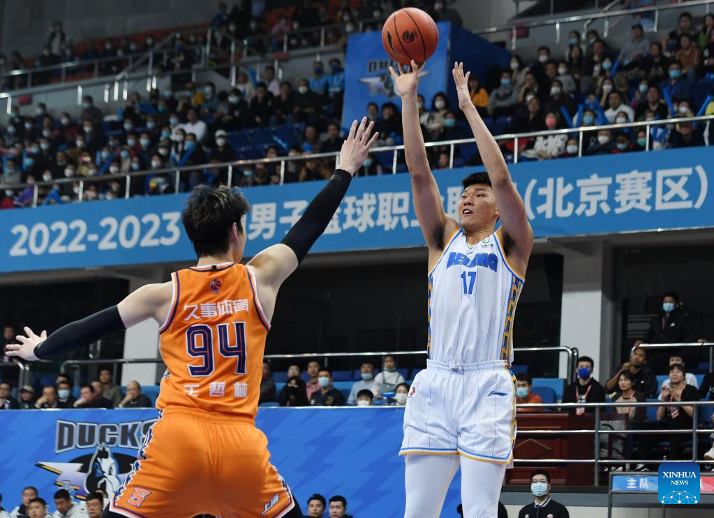 Fan Ziming (R) of Beijing Ducks shoots during the 31st round match between Beijing Ducks and Shanghai Sharks at the 2022-2023 season of the Chinese Basketball Association (CBA) league in Beijing, capital of China, March 5, 2023. (Xinhua/Zhang Chenlin)