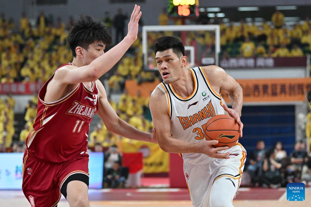 Ge Zhaobao (R) of Shanxi Loongs breaks through during the 31st round match between Shanxi Loongs and Zhejiang Golden bulls at the 2022-2023 season of the Chinese Basketball Association (CBA) league in Taiyuan, capital city of north China's Shanxi Province, March 5, 2023. (Xinhua/Zhan Yan)