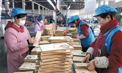 Workers assemble custom-made wooden handicrafts and jigsaw puzzles at the factory of a cultural and creative products company in east China's Jiangsu Province. (Photo/Tang Yifang)