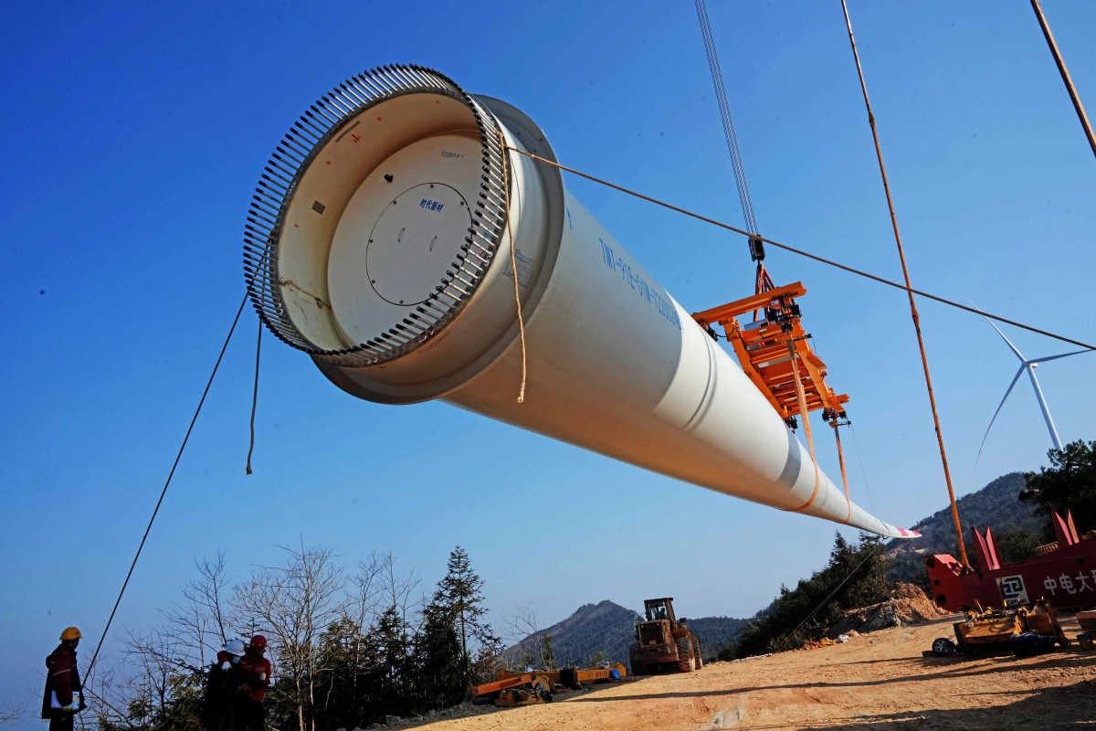 A fan blade is lifted at a wind farm in Liuzhou, Guangxi Zhuang autonomous region, in January. LONG TAO/FOR CHINA DAILY