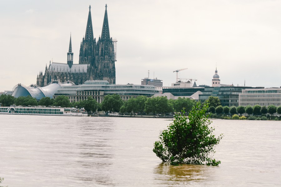 The bank of the river Rhine is seen flooded in Cologne, western Germany, July 15, 2021. (Photo by Tang Ying/Xinhua)