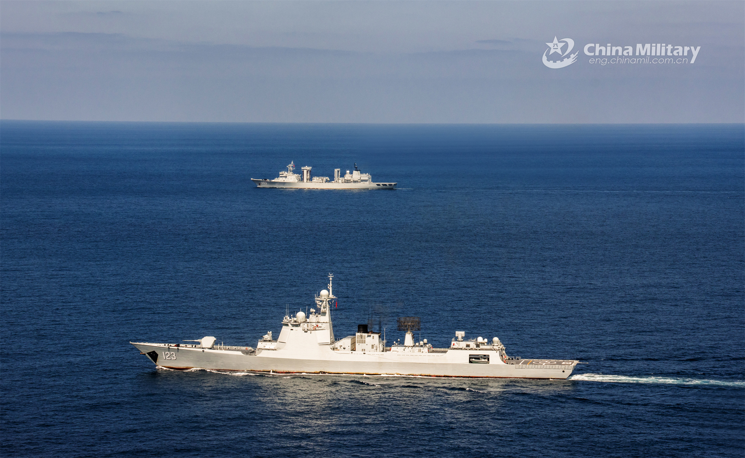 Comprehensive supply ship Kekexilihu (Hull 903) and guided missile destroyer Huainan (Hull 123) attached to the 42nd Chinese naval escort taskforce sail in formation with full speed during a comprehensive training exercise on February 3, 2023. (eng.chinamil.com.cn/Photo by Ma Yubin)