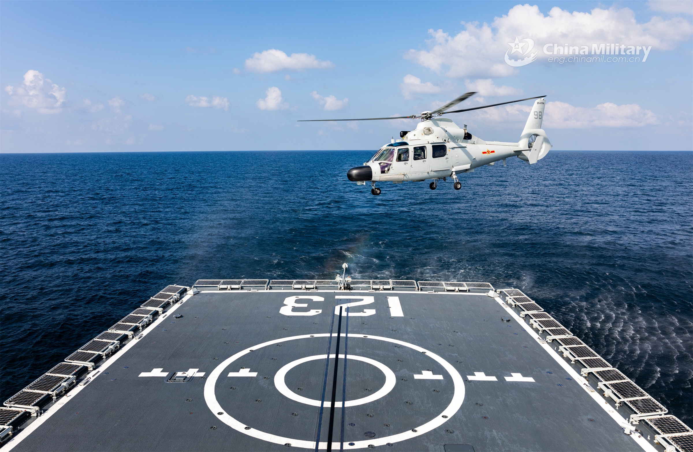A ship-borne helicopter attached to the 42nd Chinese naval escort taskforce lifts off for patrol during a comprehensive training exercise on February 8, 2023. (eng.chinamil.com.cn/Photo by Ma Yubin)