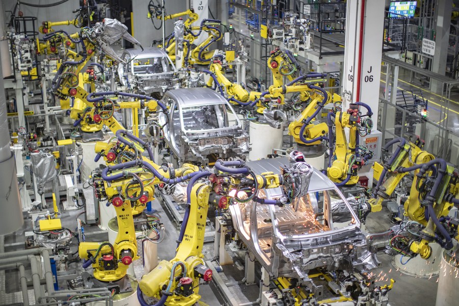 Intelligent robots weld bodies of cars at a new energy vehicle company in Chongqing, southwest China, April 2, 2021. (Xinhua/Huang Wei)