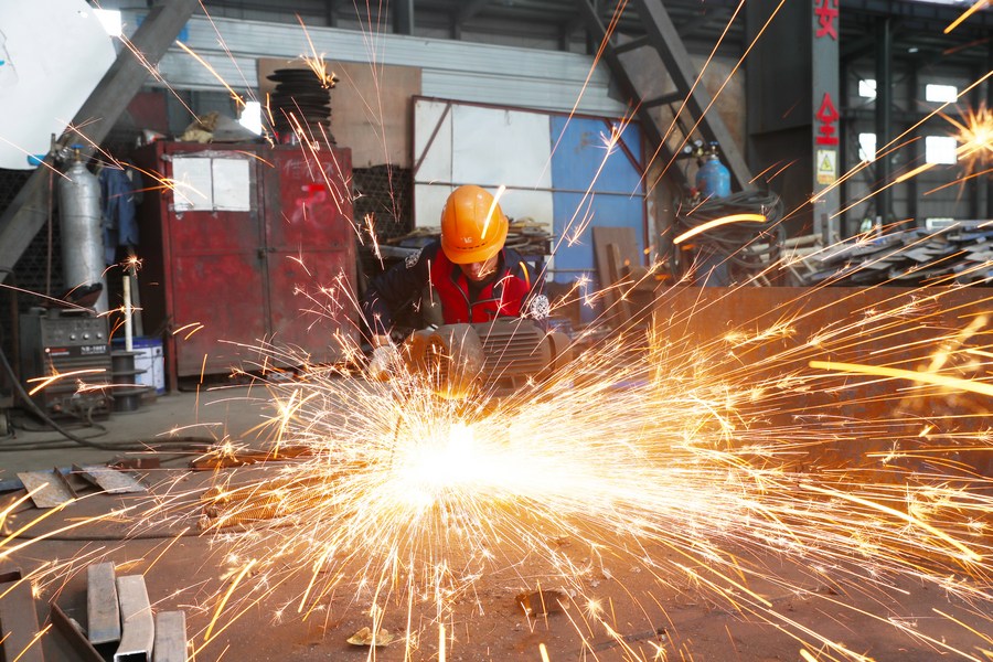 A staff member works at a workshop in an engineering machinery company in Xintian County of Yongzhou City, central China's Hunan Province, Feb. 13, 2023. (Photo by Liu Guixiong/Xinhua)