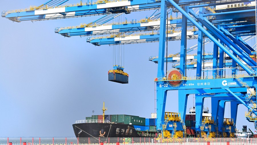 This photo taken on Feb. 25, 2023 shows an automatic container terminal at Qinzhou Port in south China's Guangxi Zhuang Autonomous Region. (Xinhua/Zhang Ailin)