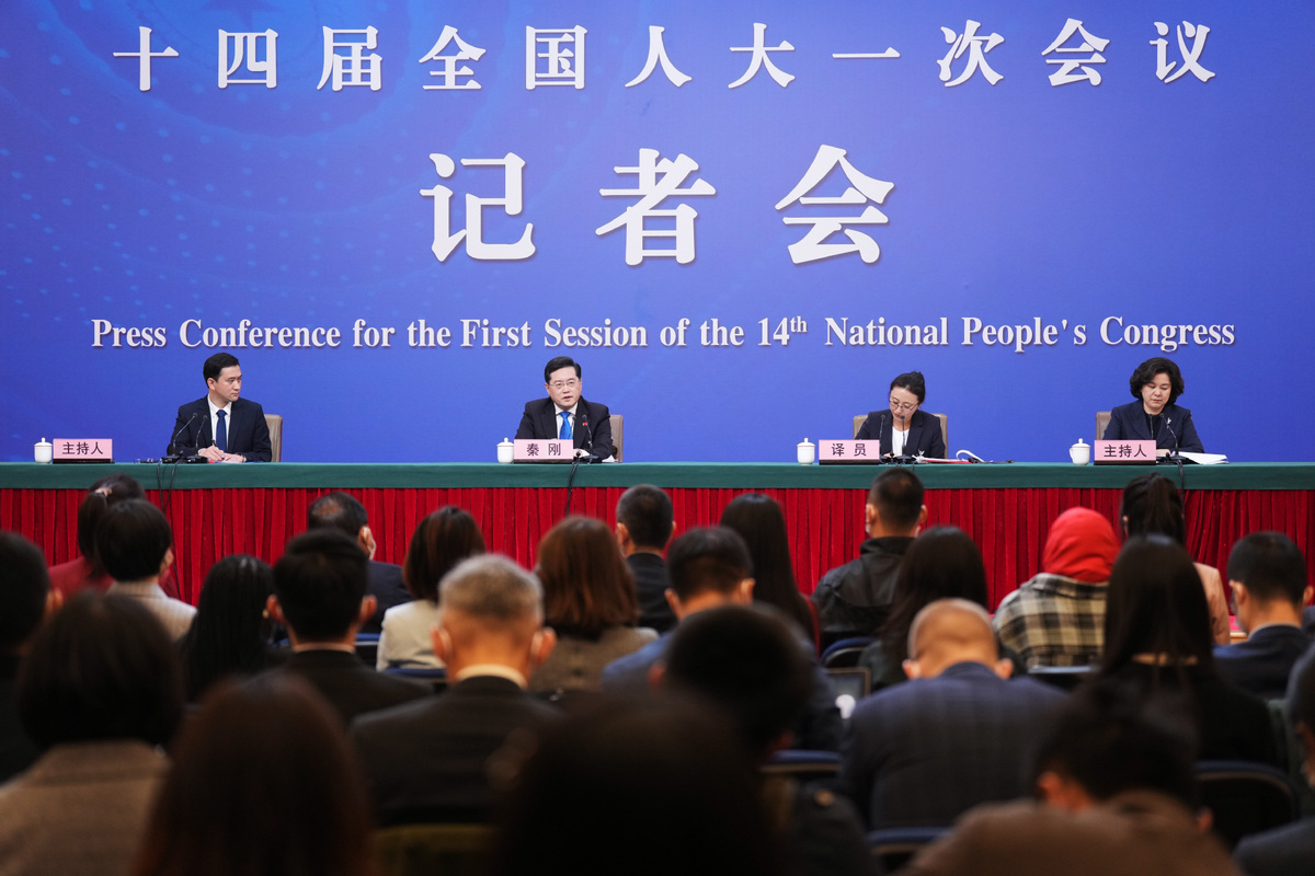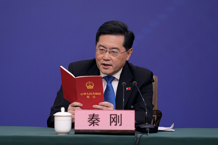 Foreign Minister Qin Gang speaks at a news conference during the first session of the 14th National People's Congress in Beijing, March 7, 2023. [Photo by Wang Zhuangfei/chinadaily.com.cn]