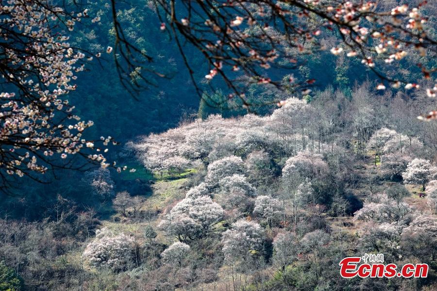Plum and cole flowers in full bloom along a mountain add colors to a village in Mianyang, southwest China's Sichuan Province. (Photo: China News Service/Hu Yu)