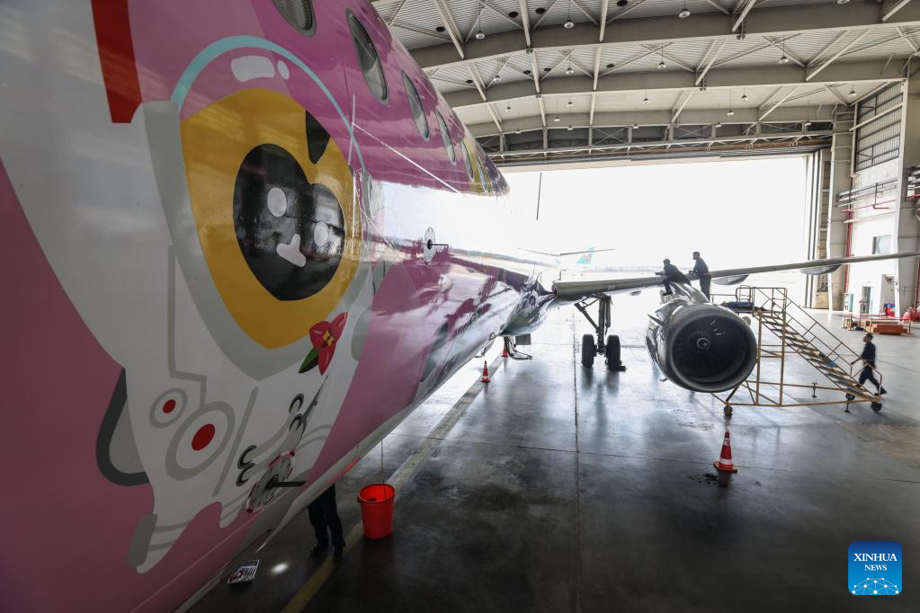 A staff member checks a themed plane to prepare for the China International Consumer Products Expo at Meilan International Airport in Haikou, south China's Hainan Province, March 7, 2023. (Xinhua/Zhang Liyun)