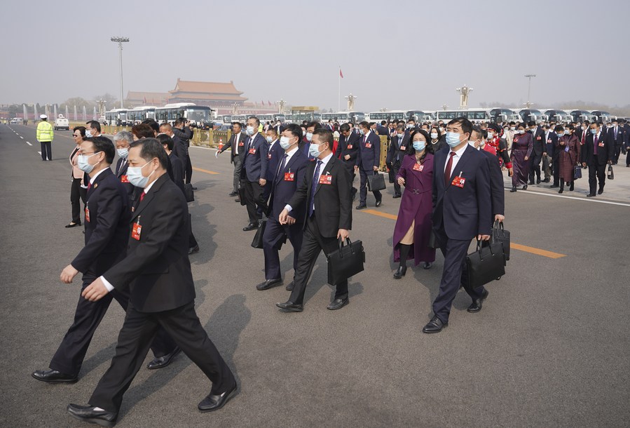 Deputies to the 14th National People's Congress (NPC) walk towards the Great Hall of the People for the second plenary meeting of the first session of the 14th NPC in Beijing, capital of China, March 7, 2023. (Xinhua/Cai Yang)