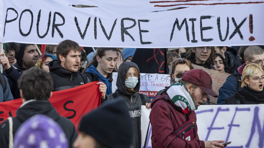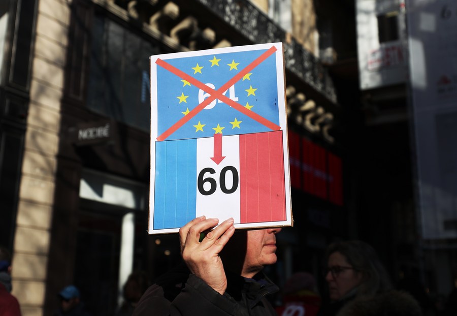 A man participates in a protest against the government's proposed pension reforms in Paris, France, on Feb. 7, 2023. (Xinhua/Gao Jing)