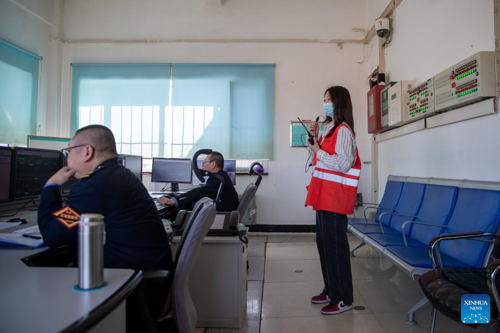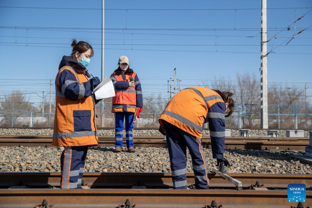 Female inspectors work at the Dorbod Railway Station in Daqing, northeast China's Heilongjiang Province, March 6, 2023. (Xinhua/Zhang Tao)