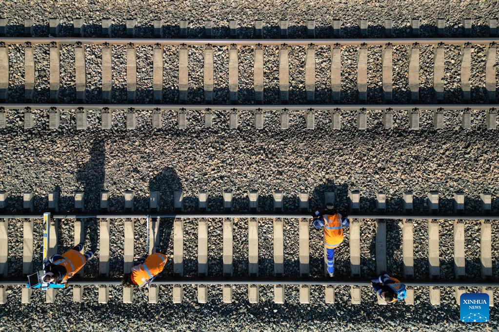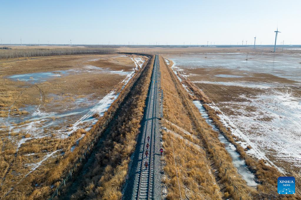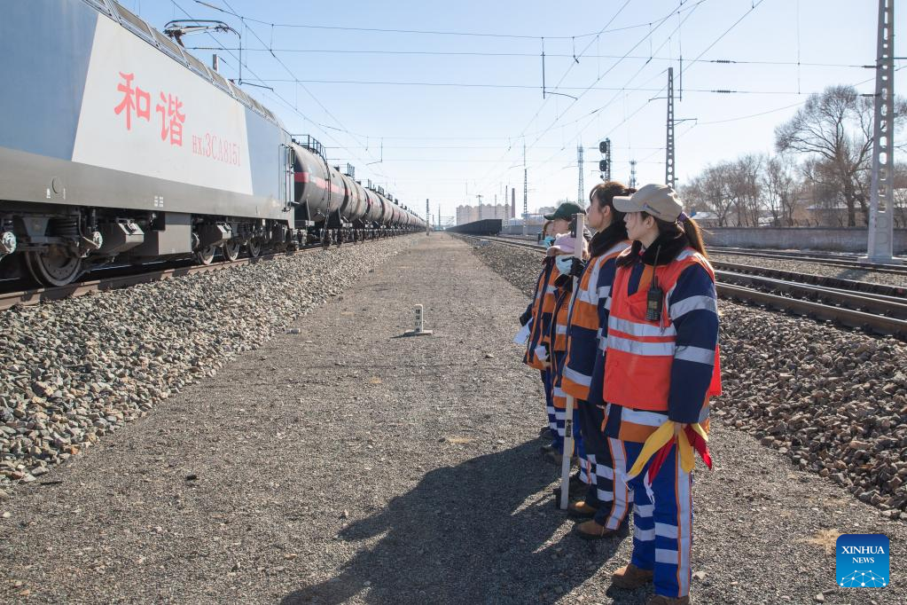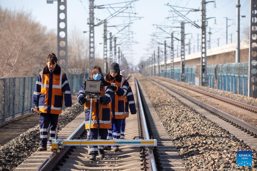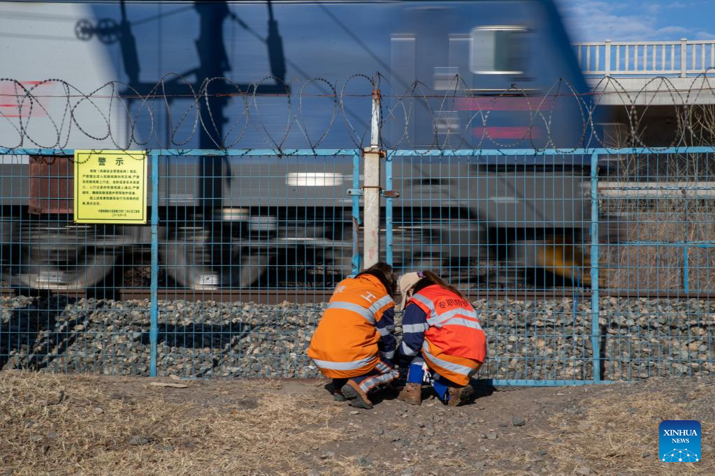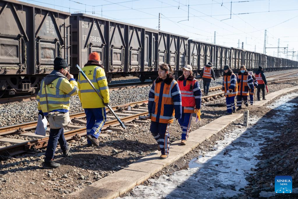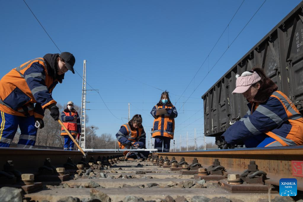 Inspectors work at the Dorbod Railway Station in Daqing, northeast China's Heilongjiang Province, March 6, 2023. (Xinhua/Zhang Tao)