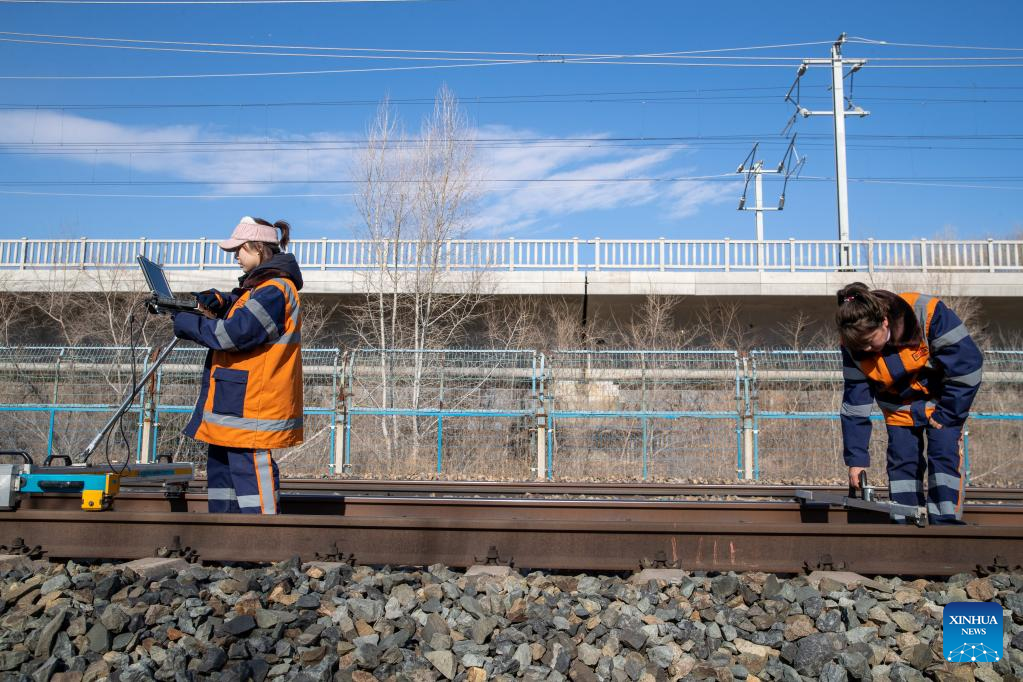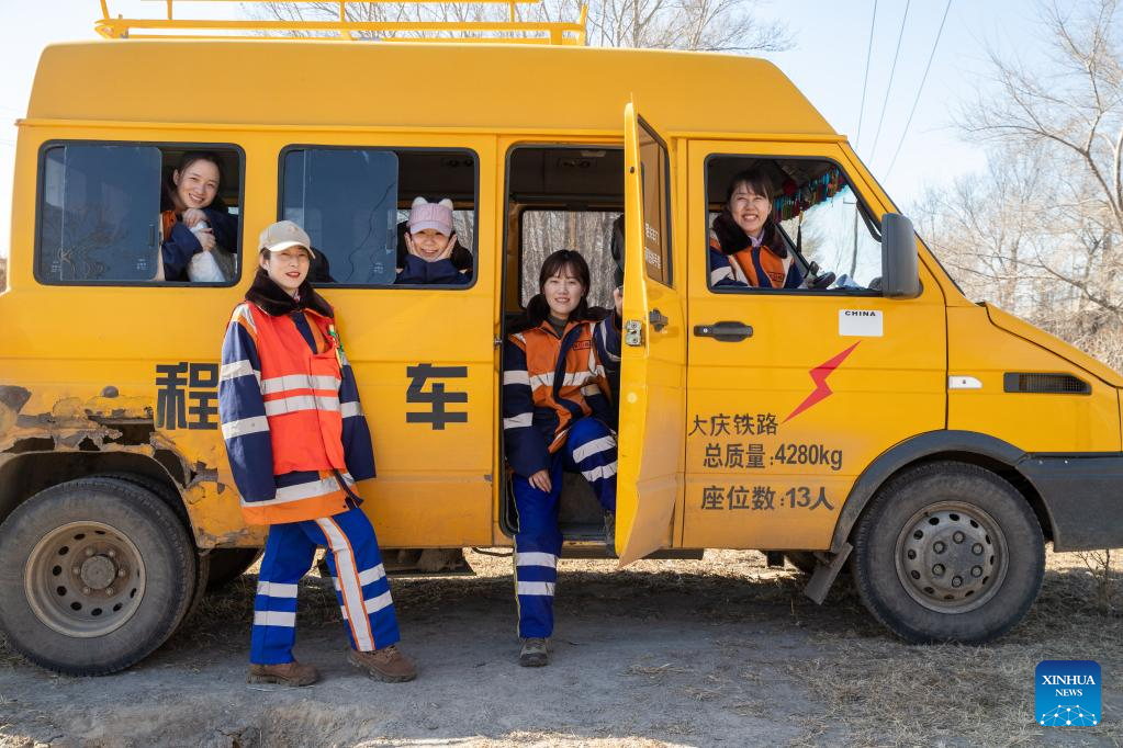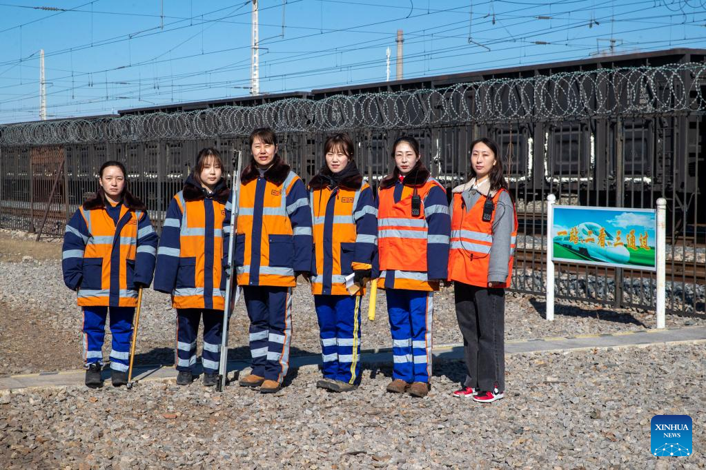 Female railway inspectors work in Daqing, northeast China's Heilongjiang Province, March 6, 2023. (Xinhua/Zhang Tao)