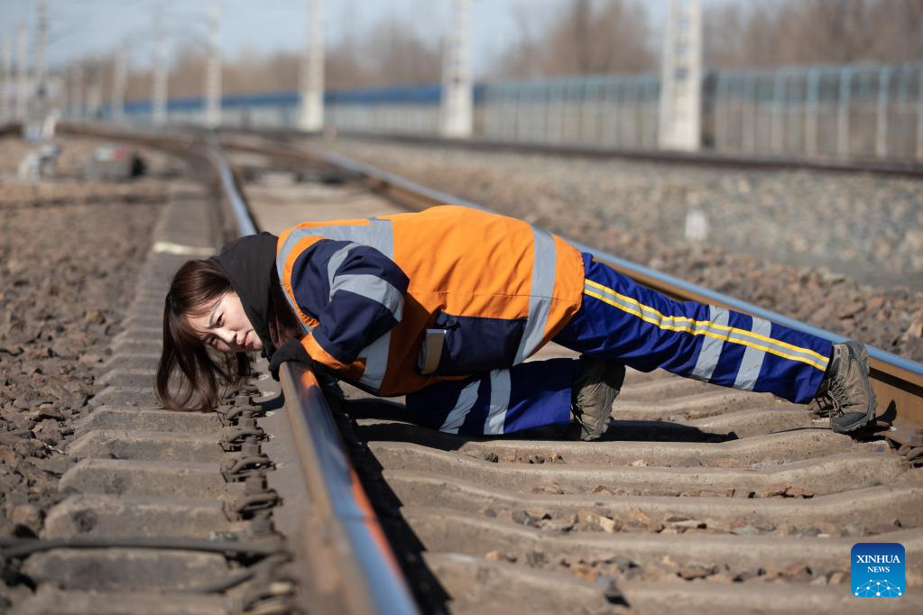 Inspector Cao Yan checks the tracks at the Dorbod Railway Station in Daqing, northeast China's Heilongjiang Province, March 6, 2023. (Xinhua/Zhang Tao)