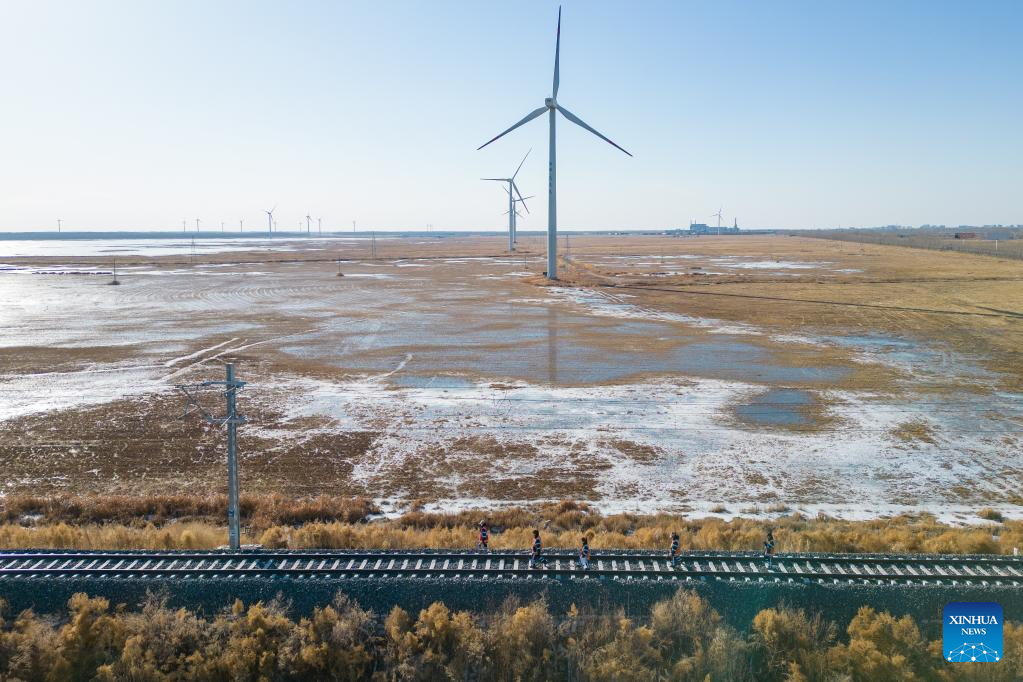 This aerial photo taken on March 6, 2023 shows female inspectors working along the Binzhou railway line in Daqing, northeast China's Heilongjiang Province. (Xinhua/Zhang Tao)