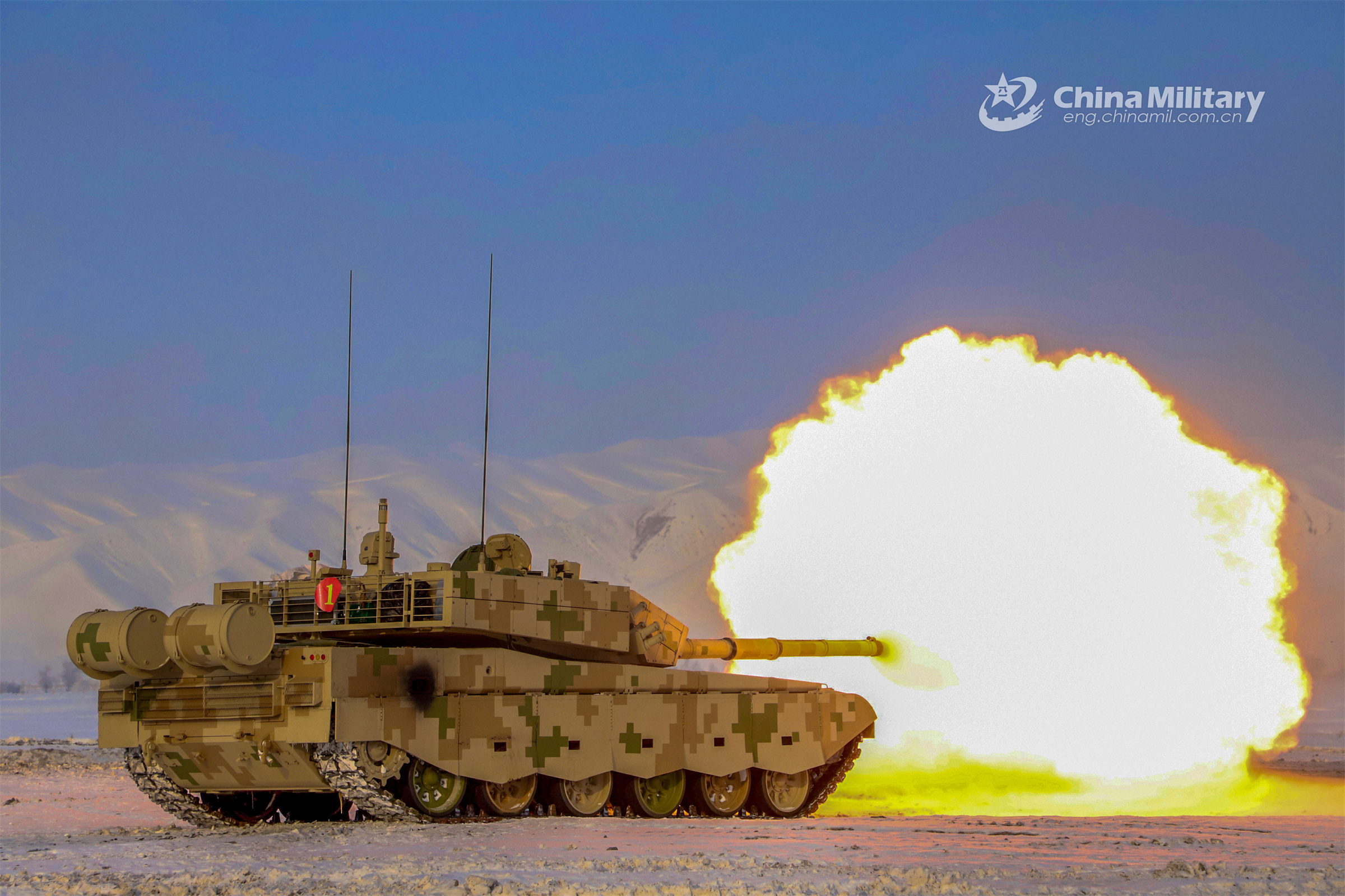 A main battle tank attached to a unit under the PLA Xinjiang Military Command fires at mock targets during a live-fire training exercise in plateau area on February 20, 2023. (eng.chinamil.com.cn/Photo by Shi Jinguang)
