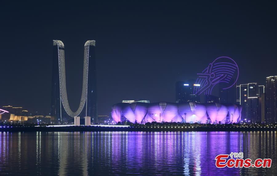 A light show featuring Hangzhou's iconic attractions is staged with 500 drones to mark the 200-day countdown of Hangzhou 2022 Asian Games at Hangzhou Olymic Sports Center Stadium, nicknamed "the Big Lotus", east China's Zhejiang Province, March 7, 2023. (Photo: China News Service/Wang Gang)