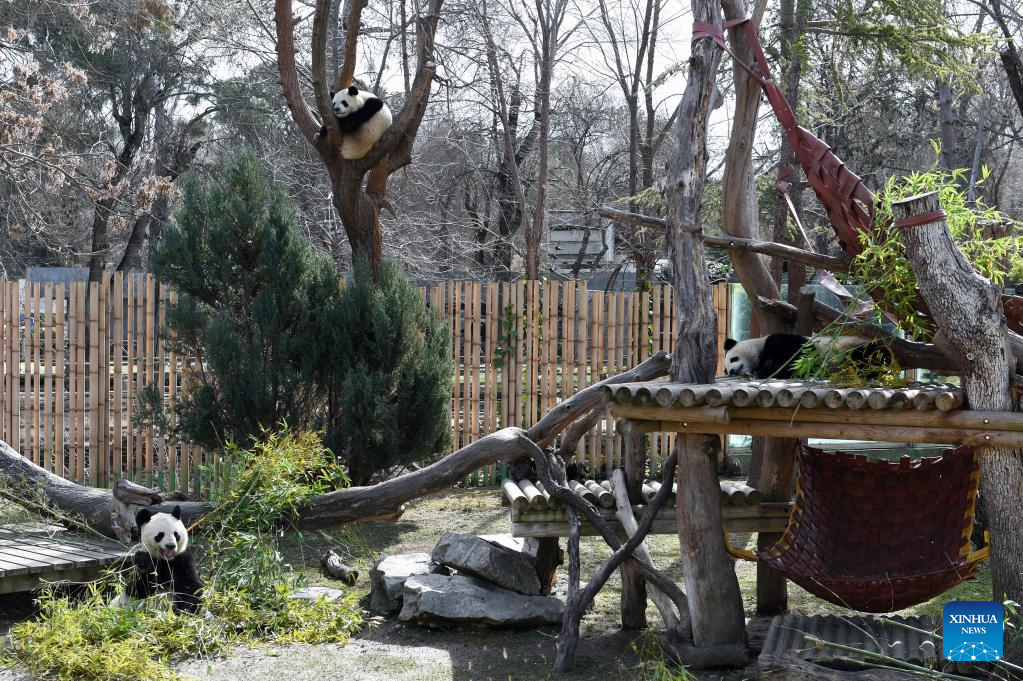 Giant pandas have fun at Zoo Aquarium in Madrid, Spain, March 7, 2023. Thanks to close cooperation between Zoo Aquarium and China Conservation and Research Center for the Giant Panda, specialists and staff members managed to breed this extremely rare species in a country far away from its homeland. You You and Jiu Jiu were born to Hua Zuiba and her partner Bing Xing in September, 2021. This giant panda family is cordially deemed a bridge of friendship between Spain and China. (Photo by Gustavo Valiente/Xinhua)