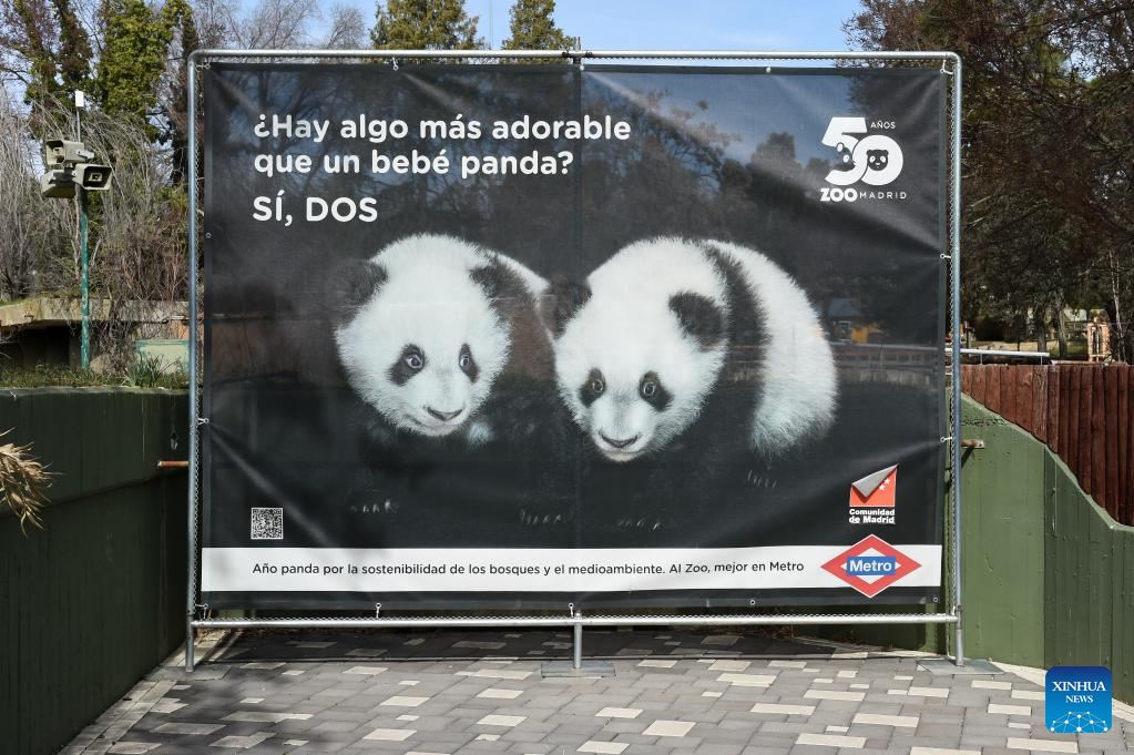A poster showing images of giant panda twins is pictured at Zoo Aquarium in Madrid, Spain, March 7, 2023. Thanks to close cooperation between Zoo Aquarium and China Conservation and Research Center for the Giant Panda, specialists and staff members managed to breed this extremely rare species in a country far away from its homeland. You You and Jiu Jiu were born to Hua Zuiba and her partner Bing Xing in September, 2021. This giant panda family is cordially deemed a bridge of friendship between Spain and China. (Photo by Gustavo Valiente/Xinhua)