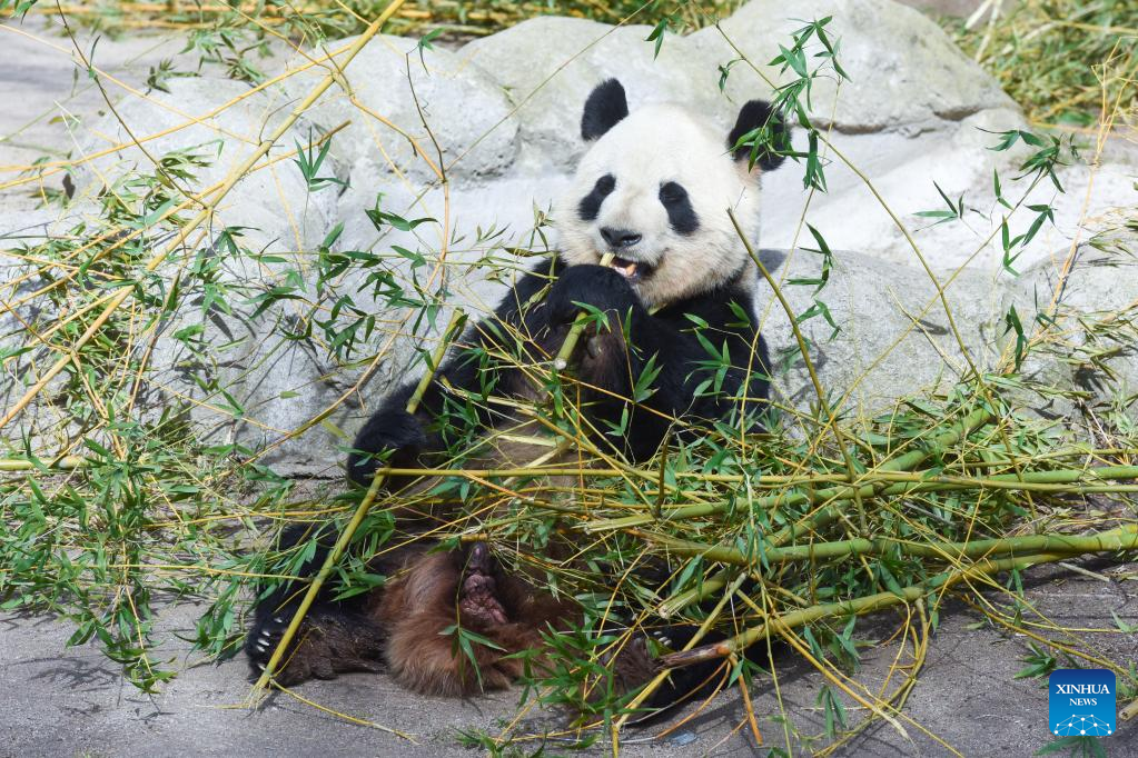 Giant panda Bing Xing has a meal at Zoo Aquarium in Madrid, Spain, March 7, 2023. Thanks to close cooperation between Zoo Aquarium and China Conservation and Research Center for the Giant Panda, specialists and staff members managed to breed this extremely rare species in a country far away from its homeland. You You and Jiu Jiu were born to Hua Zuiba and her partner Bing Xing in September, 2021. This giant panda family is cordially deemed a bridge of friendship between Spain and China. (Photo by Gustavo Valiente/Xinhua)
