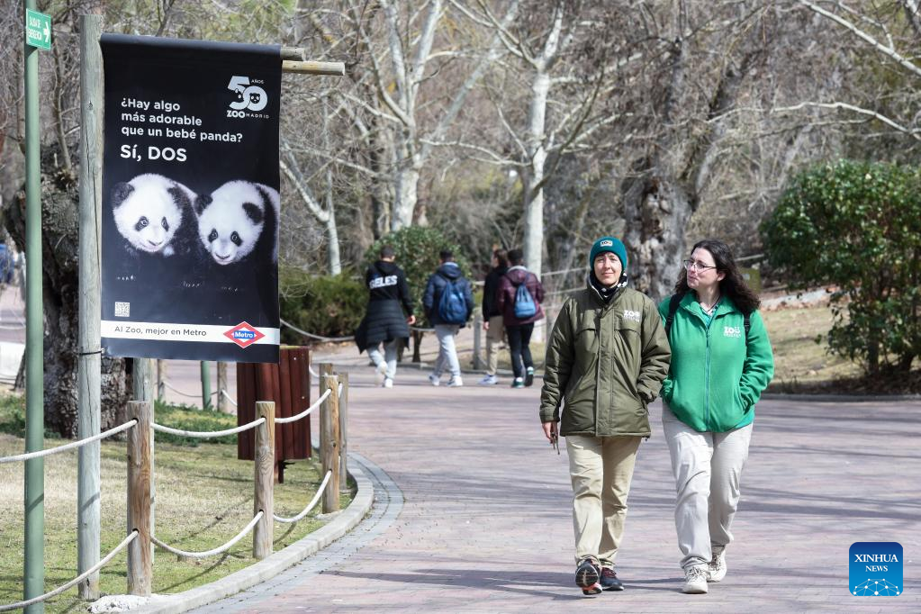 Visitors walk past a poster showing images of giant panda twins at Zoo Aquarium in Madrid, Spain, March 7, 2023. Thanks to close cooperation between Zoo Aquarium and China Conservation and Research Center for the Giant Panda, specialists and staff members managed to breed this extremely rare species in a country far away from its homeland. You You and Jiu Jiu were born to Hua Zuiba and her partner Bing Xing in September, 2021. This giant panda family is cordially deemed a bridge of friendship between Spain and China. (Photo by Gustavo Valiente/Xinhua)