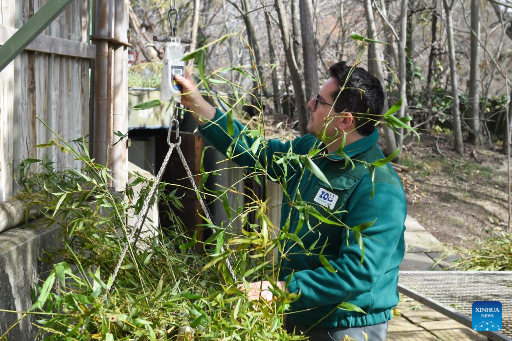 A zoo keeper prepares food for giant pandas at Zoo Aquarium in Madrid, Spain, March 7, 2023. Thanks to close cooperation between Zoo Aquarium and China Conservation and Research Center for the Giant Panda, specialists and staff members managed to breed this extremely rare species in a country far away from its homeland. You You and Jiu Jiu were born to Hua Zuiba and her partner Bing Xing in September, 2021. This giant panda family is cordially deemed a bridge of friendship between Spain and China. (Photo by Gustavo Valiente/Xinhua)