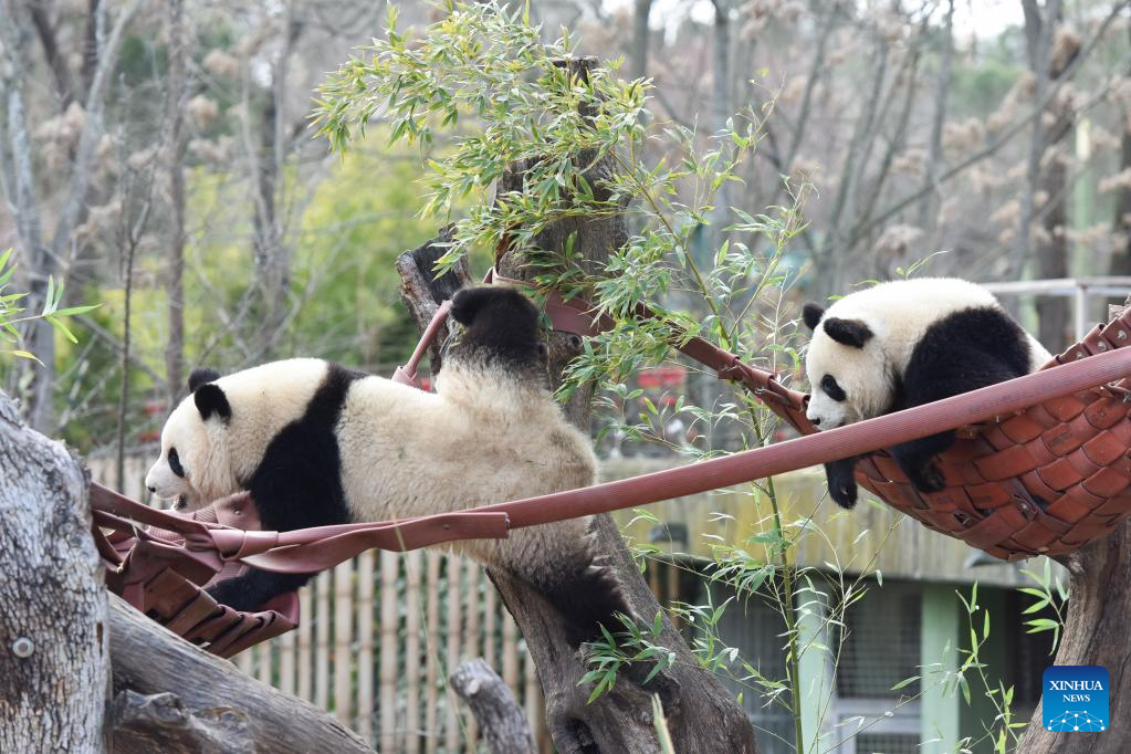 Giant pandas You You and Jiu Jiu have fun at Zoo Aquarium in Madrid, Spain, March 7, 2023. Thanks to close cooperation between Zoo Aquarium and China Conservation and Research Center for the Giant Panda, specialists and staff members managed to breed this extremely rare species in a country far away from its homeland. You You and Jiu Jiu were born to Hua Zuiba and her partner Bing Xing in September, 2021. This giant panda family is cordially deemed a bridge of friendship between Spain and China. (Photo by Gustavo Valiente/Xinhua)