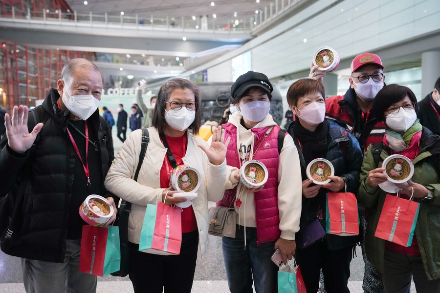 Tourists of the first tour group from Hong Kong pose for a group photo with souvenirs in their hands at Beijing Capital International Airport in Beijing, capital of China, Feb. 6, 2023. (Xinhua/Ju Huanzong)