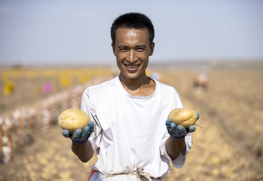 A farmer holding two potatoes poses for a picture in Hongrui Village of Pingluo County, Shizuishan, northwest China's Ningxia Hui Autonomous Region, Sept. 2, 2021. (Xinhua/Yang Zhisen)