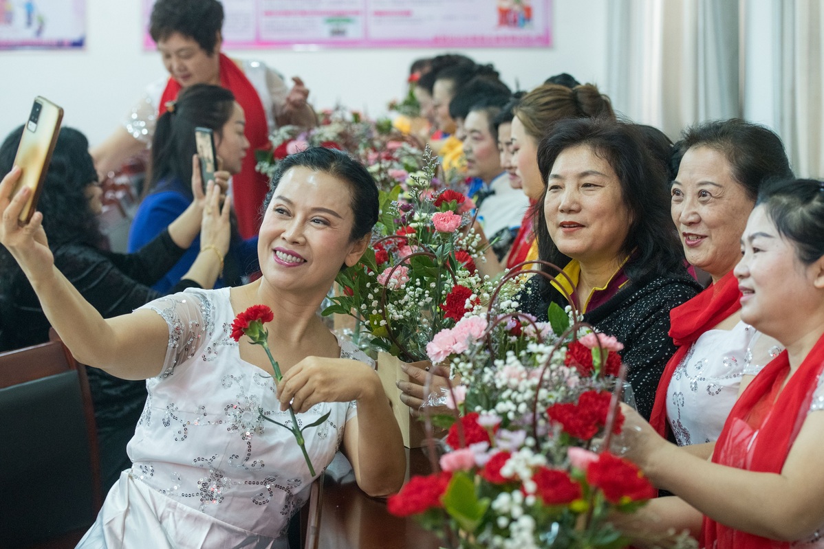 Women participate in flower-arranging activities and take selfies together in Urumqi, Xinjiang Uygur autonomous region on March 3, 2023. [Photo by Sun Zhensong/For chinadaily.com.cn]