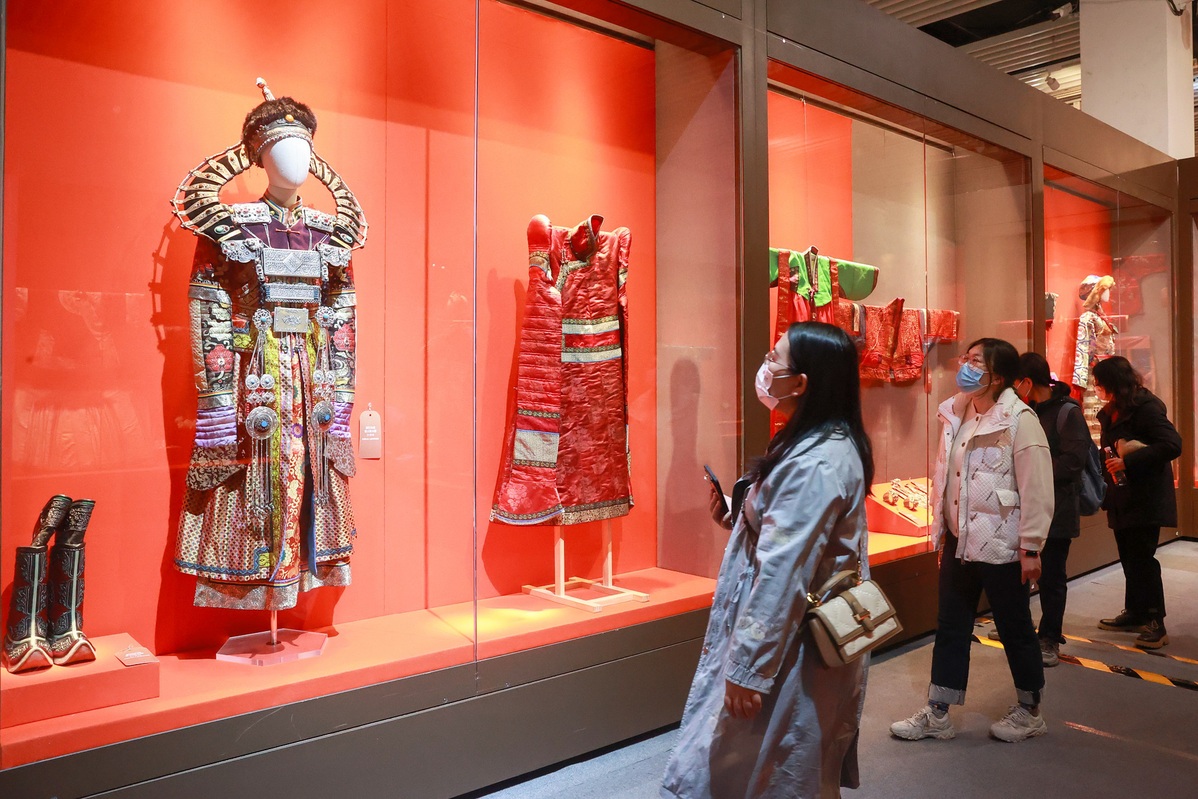 Visitors look at Chinese women's ethnic clothing displayed at the China Garden Museum in Beijing on March 7, 2023. [Photo by Chen Xiaogen/For chinadaily.com.cn]
