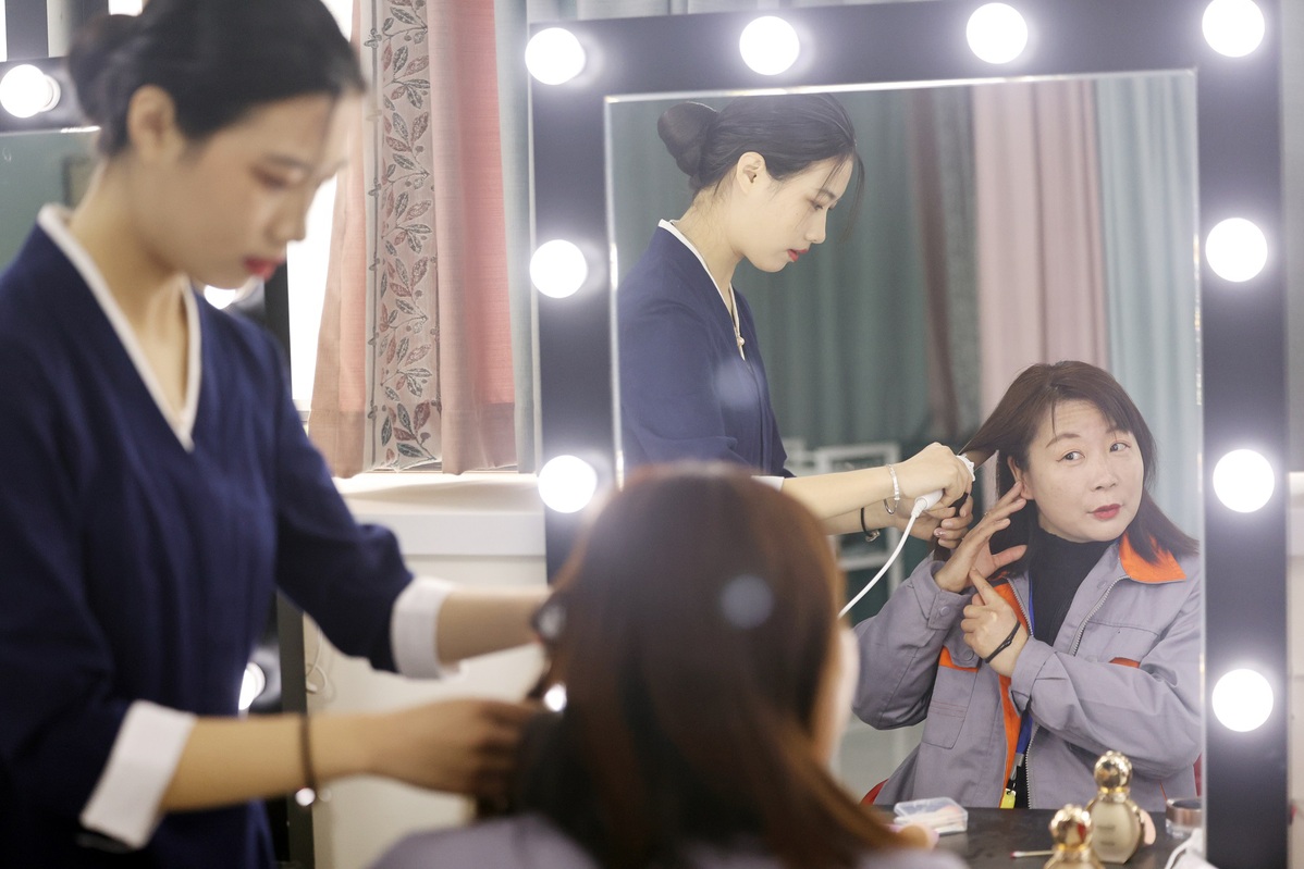 An aviation-majored college student applies makeup for her dormitory manager and presents her with a holiday gift on March 7, 20223. [Photo by Xu Peiqin/For chinadaily.com.cn]