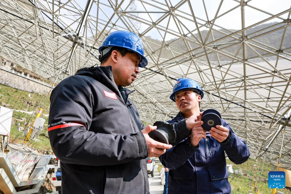 Jiang Peng (L) talks with a colleague under the reflection panels of the FAST during its maintenance period in Pingtang County, southwest China's Guizhou Province, Feb. 13, 2023. China's Five-hundred-meter Aperture Spherical Radio Telescope (FAST), the world's largest single-dish radio telescope, is located in Pingtang County of southwest China's Guizhou Province. Jiang Peng, a deputy to the 14th National People's Congress (NPC) and chief engineer of the FAST, fulfilled the adjusting mission of the telescope with his team members and made its comprehensive capability reach the world's leading level. (Xinhua/Ou Dongqu)