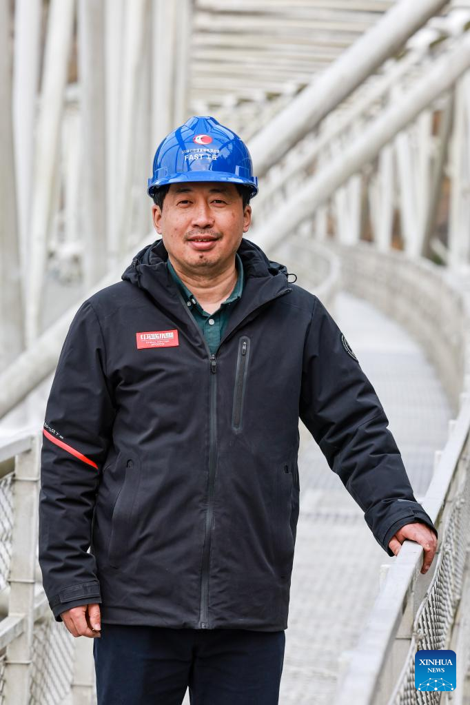 Jiang Peng is seen on the ring beam of the FAST during its maintenance period in Pingtang County, southwest China's Guizhou Province, Feb. 13, 2023. China's Five-hundred-meter Aperture Spherical Radio Telescope (FAST), the world's largest single-dish radio telescope, is located in Pingtang County of southwest China's Guizhou Province. Jiang Peng, a deputy to the 14th National People's Congress (NPC) and chief engineer of the FAST, fulfilled the adjusting mission of the telescope with his team members and made its comprehensive capability reach the world's leading level. (Xinhua/Ou Dongqu)
