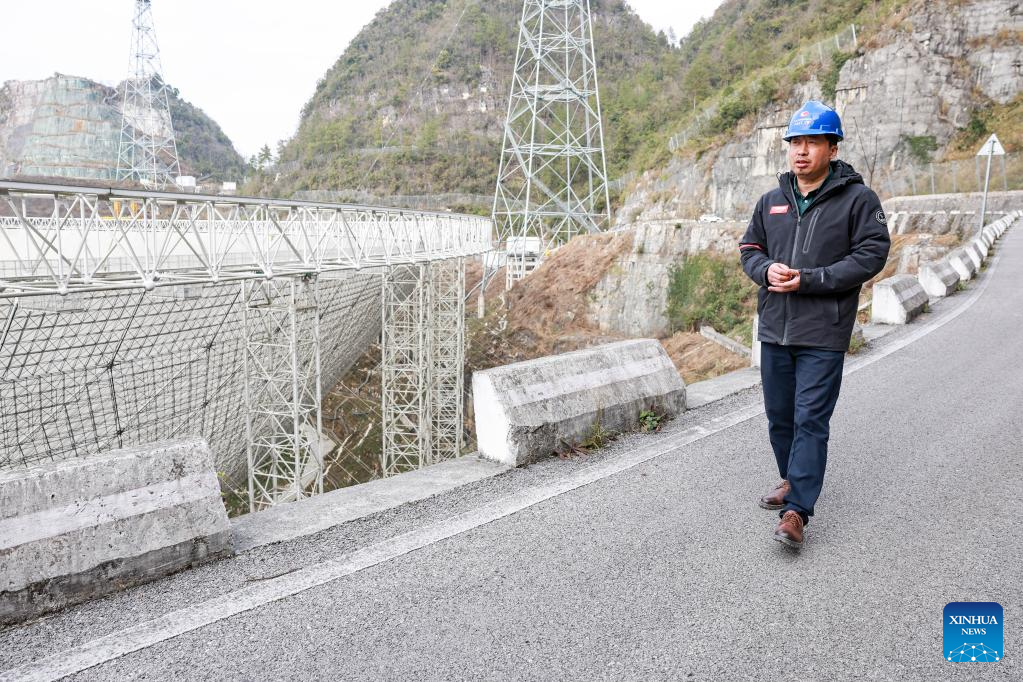 Jiang Peng walks past the FAST during its maintenance period in Pingtang County, southwest China's Guizhou Province, Feb. 13, 2023. China's Five-hundred-meter Aperture Spherical Radio Telescope (FAST), the world's largest single-dish radio telescope, is located in Pingtang County of southwest China's Guizhou Province. Jiang Peng, a deputy to the 14th National People's Congress (NPC) and chief engineer of the FAST, fulfilled the adjusting mission of the telescope with his team members and made its comprehensive capability reach the world's leading level. (Xinhua/Ou Dongqu)