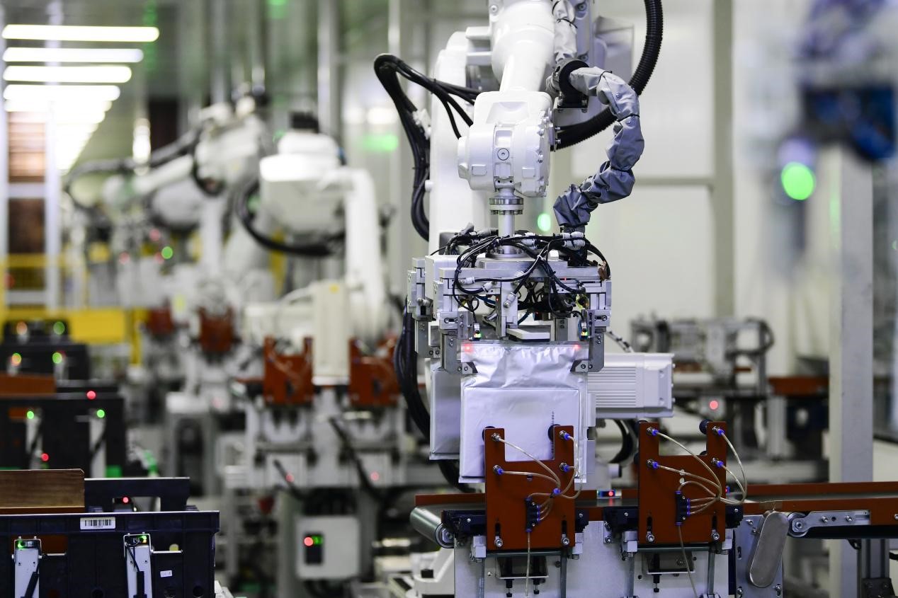 Robotic arms are manufacturing power batteries for new energy vehicles in a workshop of a company in Ganzhou, east China's Jiangxi province, Feb. 8, 2023. (People's Daily Online/Hu Jiangtao)