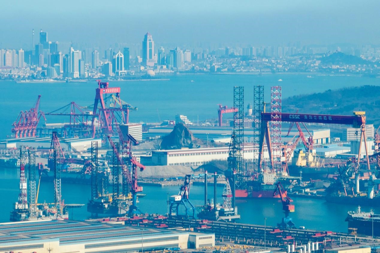 Photo taken on Feb. 26, 2023 shows a shipbuilding base in Xihai'an (West Coast) New Area of Qingdao, east China's Shandong province. (People's Daily Online/Han Jiajun)