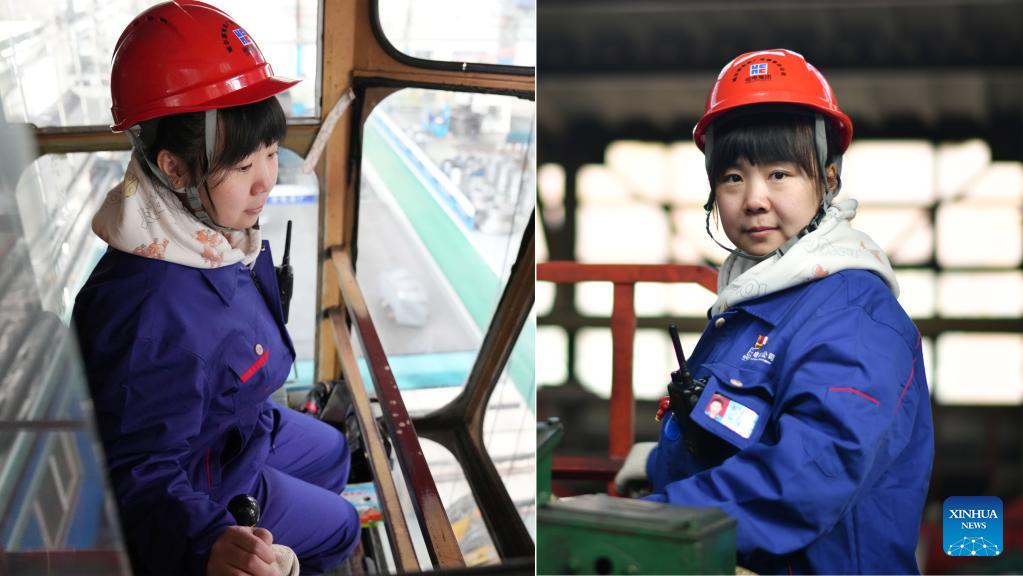 This combo photo shows crane operator Li Yinan working (L) and posing for a photo at a workshop of Harbin Electric Machinery Company Ltd. of Harbin Electric Corporation in Harbin, northeast China's Heilongjiang Province, March 6, 2023. (Xinhua/Wang Jianwei)