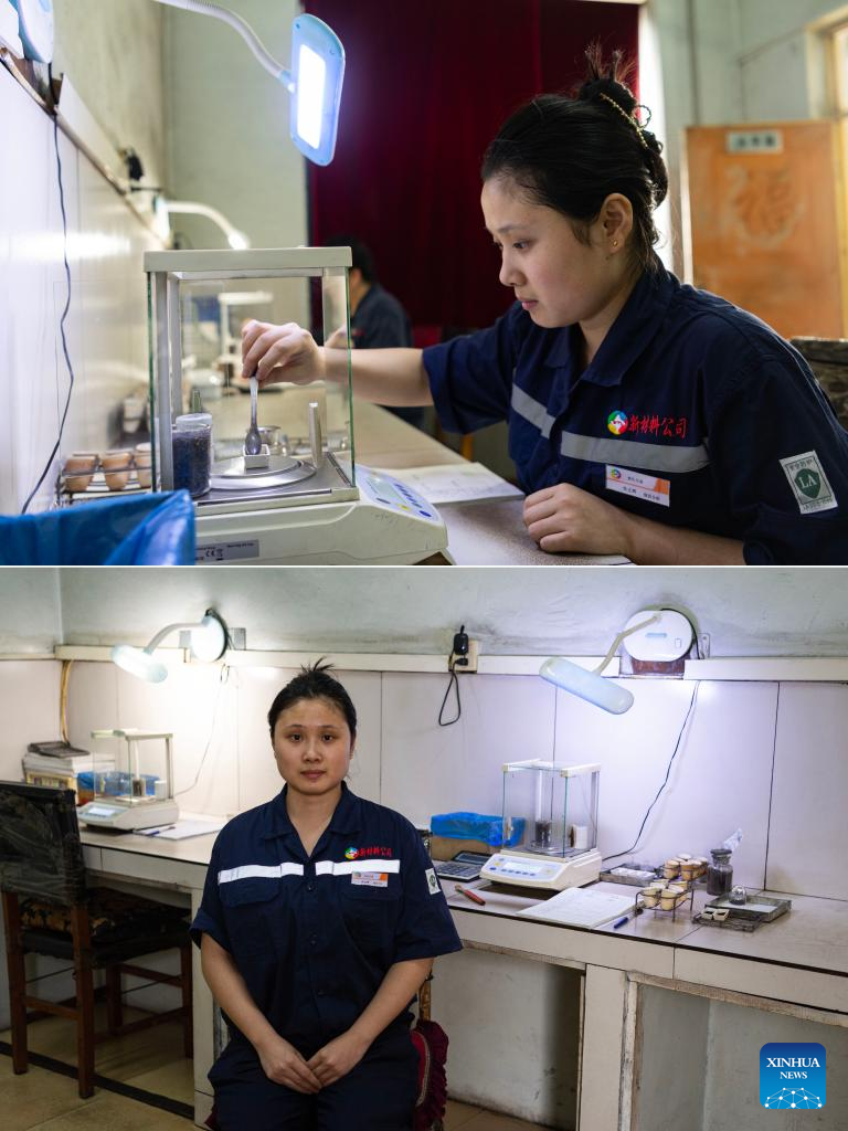 This combo photo shows flaw detector Li Hong working (L) and posing for a photo at Harbin Boiler Company Ltd. of Harbin Electric Corporation in Harbin, northeast China's Heilongjiang Province, March 6, 2023. (Xinhua/Wang Jianwei)
