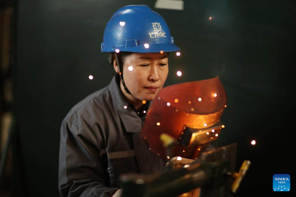 Welder Zhang Jinghua works at China Railway Rolling Stock Corporation (CRRC) Qiqihar Rolling Stock Co., Ltd in Qiqihar, northeast China's Heilongjiang Province, March 6, 2023. (Photo by Zhang Yunsong/Xinhua)