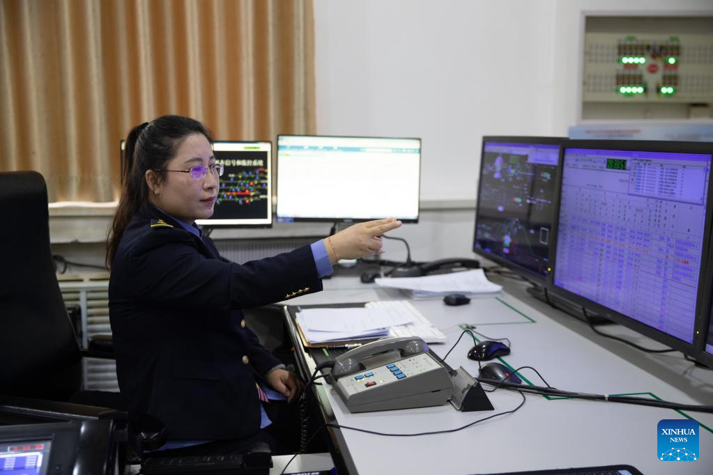 Train station staff member Zhang Jun issues commands to trains entering Daqing West Railway Station in Daqing, northeast China's Heilongjiang Province, March 7, 2023. (Xinhua/Zhang Tao)