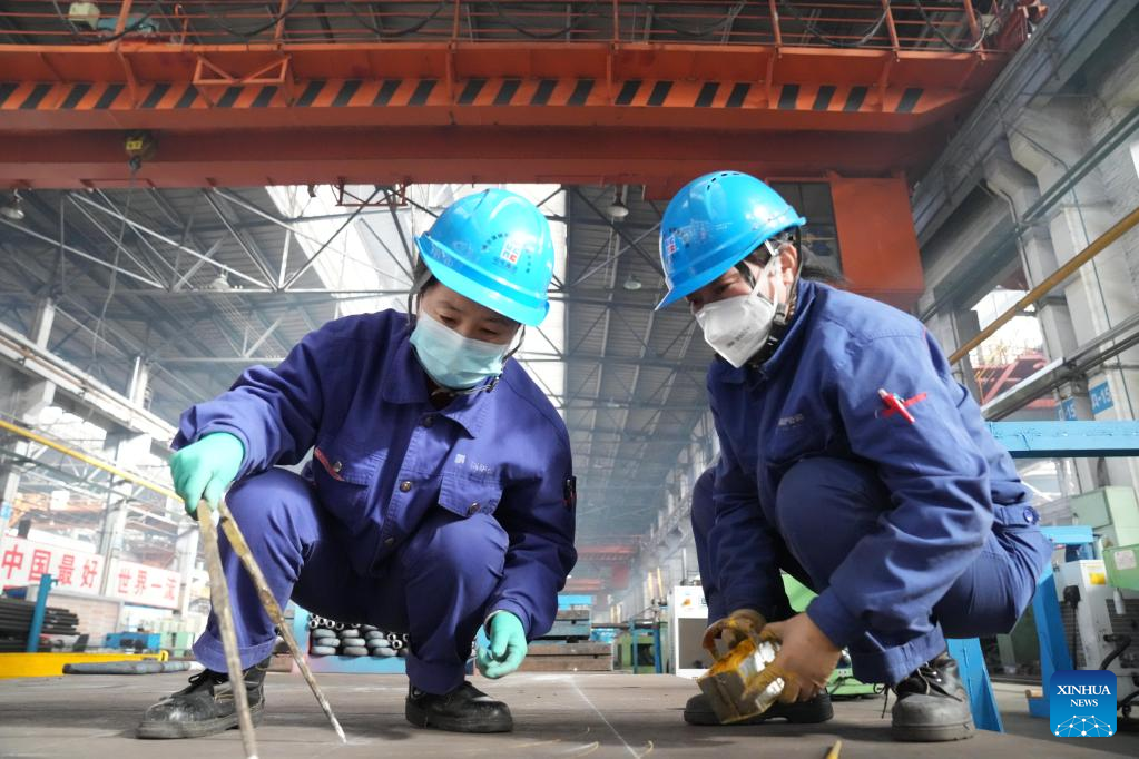Employees Liu Li (L) and Liu Lili work at Harbin Boiler Company Ltd. of Harbin Electric Corporation in Harbin, northeast China's Heilongjiang Province, March 6, 2023. (Xinhua/Wang Jianwei)
