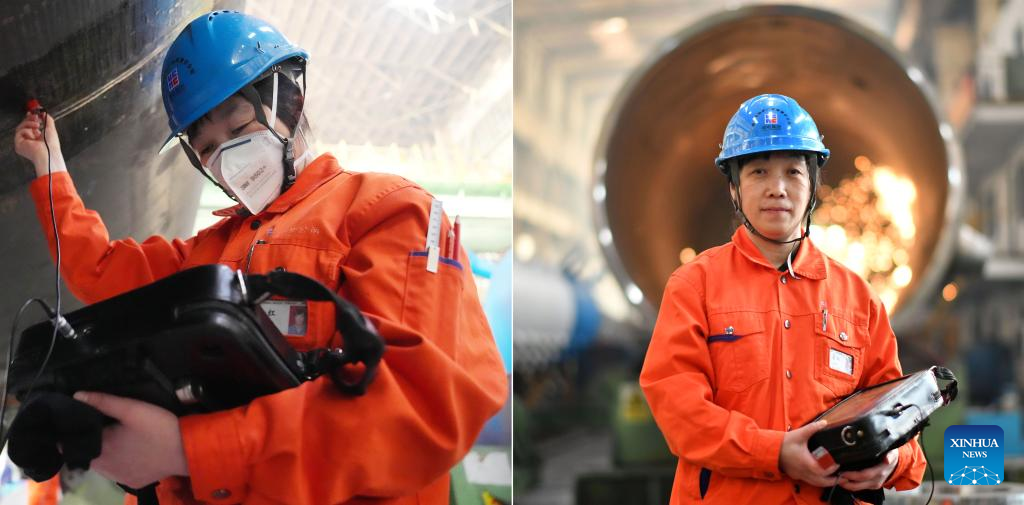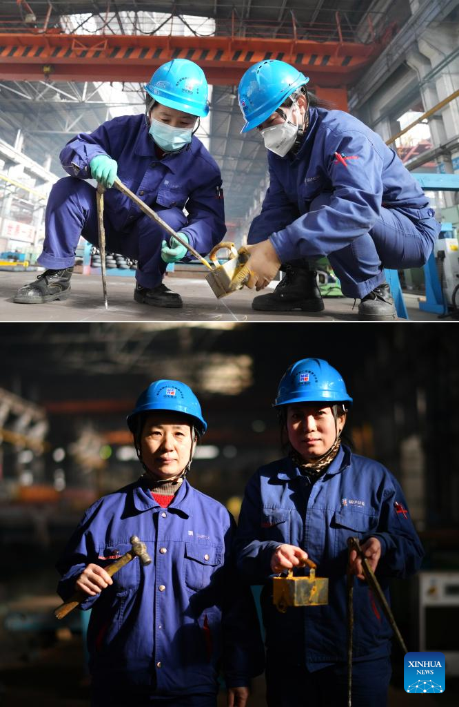 This combo photo shows workers Liu Li (L) and Liu Lili working (above) and posing for a photo at Harbin Boiler Company Ltd. of Harbin Electric Corporation in Harbin, northeast China's Heilongjiang Province, March 6, 2023. (Xinhua/Wang Jianwei)